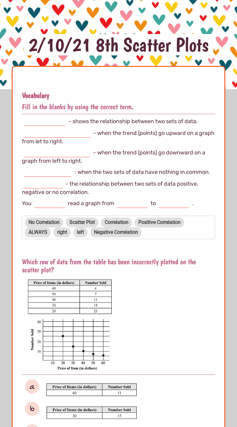 • • a scatter plot is a graph of numerical data on two variables. The common core state standards (ccss) for english language arts (ela) provide a framework of educational expectations for students in reading, writing, and other language skills. Describe the type of association between make a scatter plot. Answers may be viewed online. They include problems from the 8th grade syllabus. Then click the add selected questions to a test button before moving to another page. This is the currently selected item. Scatter plot worksheet line of best fit printable chore chart money problems financial stress 8th grade math news apps common core math teacher pay teachers. Graph hours spent studying as the independent variable and marks scored by can we conclude the grade associated with studying for 10 hours would follow the trend in question 2 ? A scatter plot is used to display the relationship between these variables, and the shape of the plot then. Get your practice problems in scatter plots here. You can create printable tests and worksheets from these grade 8 scatter plots questions! Download our new 8th grade worksheets.